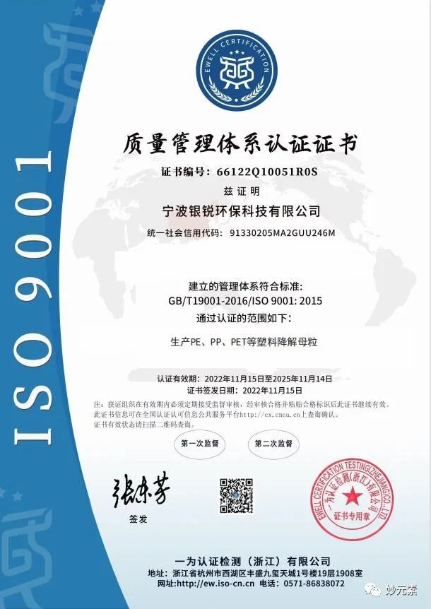 銀銳環保自成立以來,一直深耕塑料降解領域,專注解決傳統塑料的降解解決方案。企業上下堅信“質量”是贏得客戶信賴的最根本因素,始終將質量管理體系建設放在重要位置。在產品開發過程中,各部門不斷加強溝通協作,建立了規范化的業務流程及驗收標準。從項目溝通到每一個客戶案例,銀銳環保將每一個環節都視為關鍵環節,不忽視任何細節,嚴把每一道質量關。正是對品質的高標準嚴要求,銀銳的產品及服務收獲了眾多客戶的好評,目前業務已覆蓋國內外1000+用戶,助力眾多客戶實現塑料生產企業解決塑料污染。銀銳環保將以本次認證為契機,進一步完善質量管理體系建設工作,持續有效地推進企業質量體系運行的科學化、規范化,將質量標準貫徹落實到每一項工作、每一個環節中,為公司持續穩定健康發展提供重要保障,不斷提升核心競爭力,推動企業高質量發展!