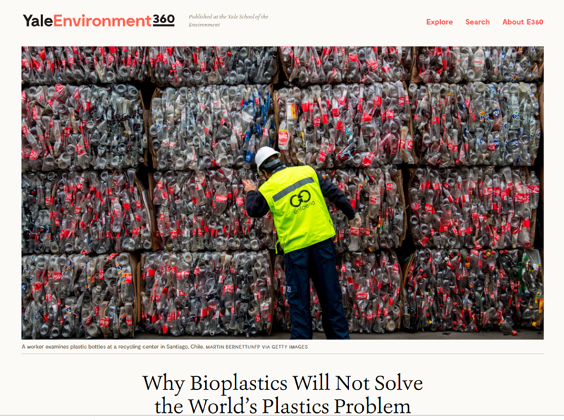 耶魯大學環境學院網站發表署名Jim Robbins的文章,題目是:Why Bioplastics Will Not Solve the World’s Plastics Problem(為什么生物塑料不能解決世界塑料問題)。文章指出,生物塑料正被業內人士吹捧為解決塑料污染的方法,但是實際上用植物材料制成的瓶子和包裝可以隨意丟棄然后自然分解消失的想法是錯誤的——回收和再利用塑料才是唯可行的策略。