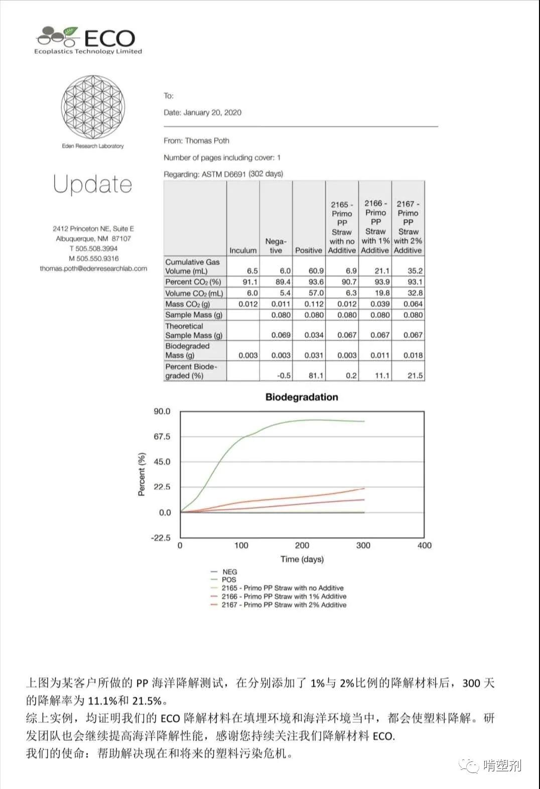 那答案是正面的,根據客戶的產品所進行過ASTM D6691(塑料制品海洋降解測試標準),加入了ECO 的PET 纖維及NYLON 纖維都能夠在250內降解14.4% 及17.2%。明顯的這個塑料降解速度不如在厭氧環境下的降解速度。但考慮到海水中的微生物濃度比起在污泥中低很多。所以這個結果已經是令人相當。若我們的衣服或纖維制品中加入ECO,那么些產品在廢棄后能在厭氧的堆埋場中被降解并產生潔凈能源(甲烷),又能改善微塑膠進入人類生態圈(海洋和陸地)的問題。或許我們可以有這樣一個的假設設, 加入了ECO 的衣服纖維能夠在 10年內完全被降解, 那么我們就可以更容易控制海洋中微塑膠的數量了.