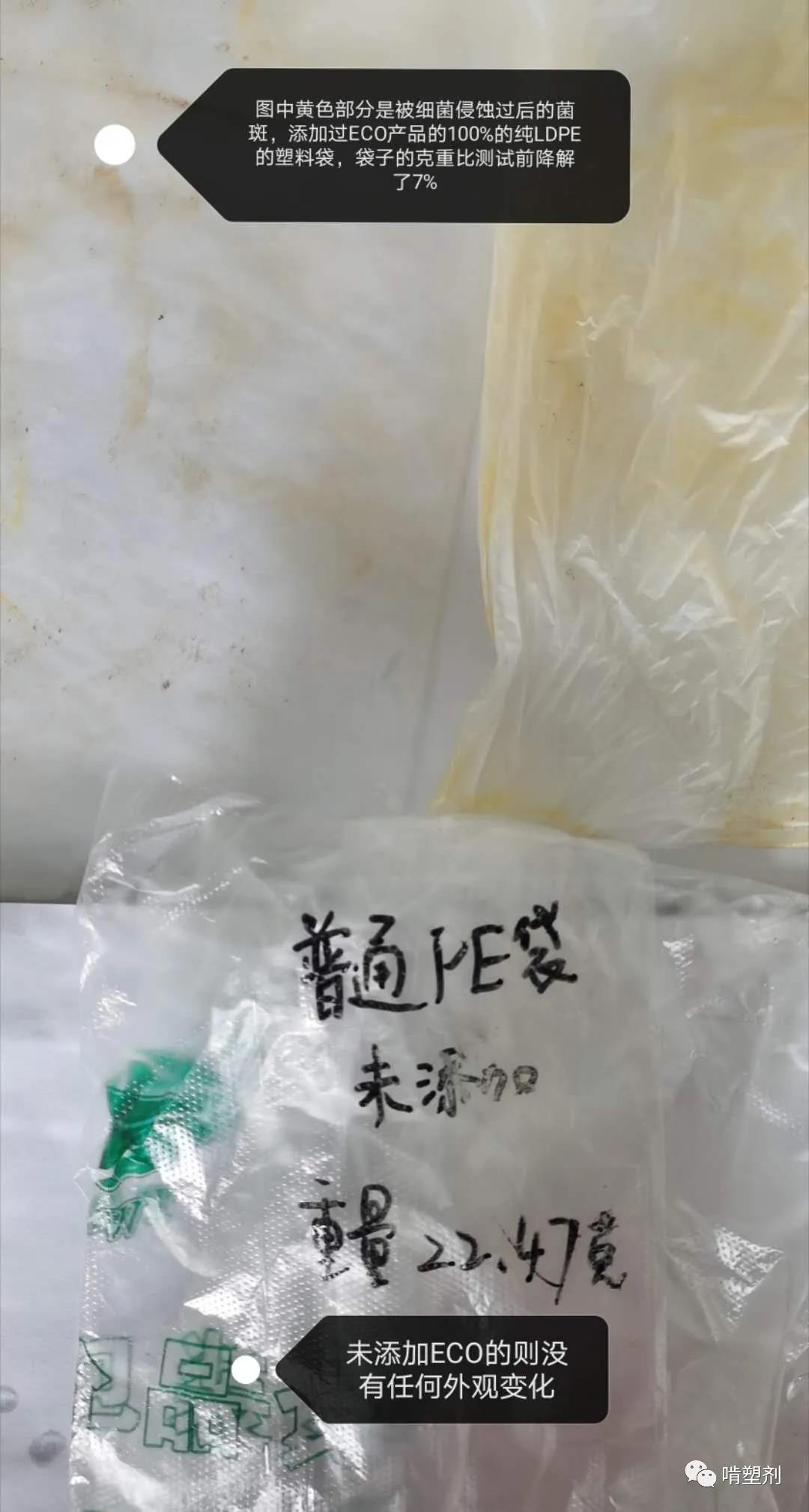 之前研究人員做過這個實驗, 把加入ECO 啃塑劑后的 LDPE 塑料袋和沒有加入ECO 的LDPE 袋放入污水污泥中. 經過45天后, 從兩個袋的表面我們可以觀察到有很大的差異。在沒有加入ECO 的LDPE袋, 我們看不到有明顯的變化. 但在加入了ECO 的LDPE 袋, 我們發表面已經開始被微生物侵蝕。