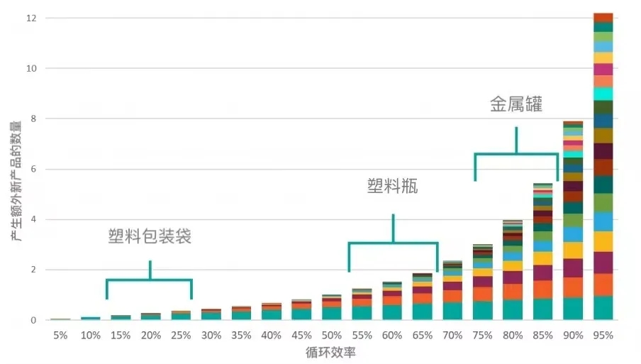 其他包裝材料介于兩者之間,高產量的材料,如鋁,與許多塑料相比有著更高的循環效率。圖表顯示,對于一種以65%的循環效率成為新產品的材料(高于歐盟2030年55%的塑料回收率目標),原始材料在循環了足夠長的時間后,在它基本消失前僅產生了2個額外的新產品(在每個循環之后只有65%的材料被保留);相比之下,一個循環效率為90%的材料在足量循環后將產生8個新產品。