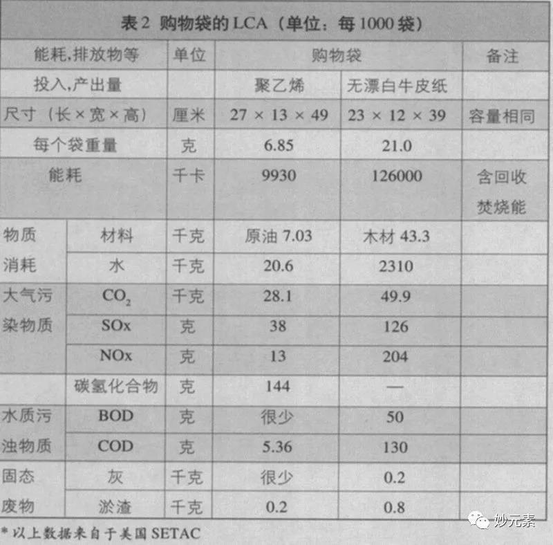 其中表一結果表明,在容量相同的情況下,紙袋的能耗是PE(聚乙烯)購物袋的1.5~2倍(隨再生率的提高,二者能耗差距減小)。PE購物袋在產生的固體垃圾數量和廢氣排放量方面,也要低于紙購物袋。造紙業是重污染行業。在生產的過程中,紙袋要比塑料袋多消耗10%的能量,耗水量更是塑料袋的四倍,造成的溫室氣體排放是塑料袋的3.3倍。紙袋可能造成的大氣酸化和空氣質量惡化分別為塑料袋的1.9倍和1.3倍。在水體富營養化方面,紙袋可能造成的污染是塑料袋的14倍。結束使用周期后,紙袋還會造成2.7倍于塑料袋的固體廢棄物。這些結果表明聚乙烯塑料袋對環境造成的負荷程度比紙袋要低。表二更清晰的對比了紙袋,可降解塑料袋和普通塑料袋的對環境的影響,結論還是塑料袋對于環境的危害最小。