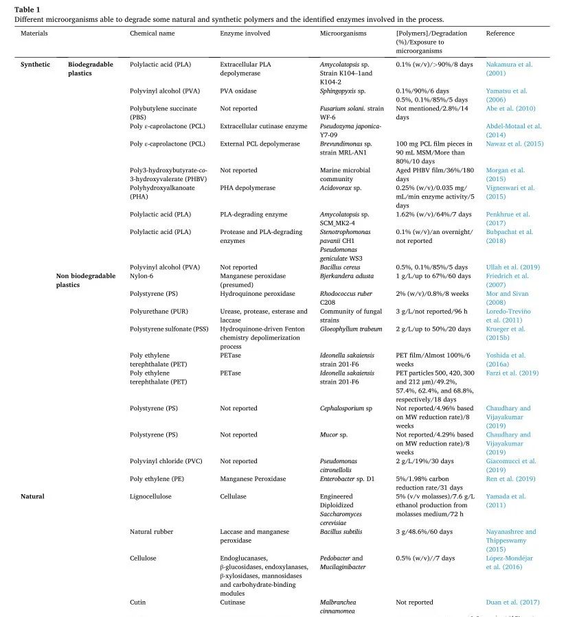 表1:塑料降解微生物以及已鑒定酶